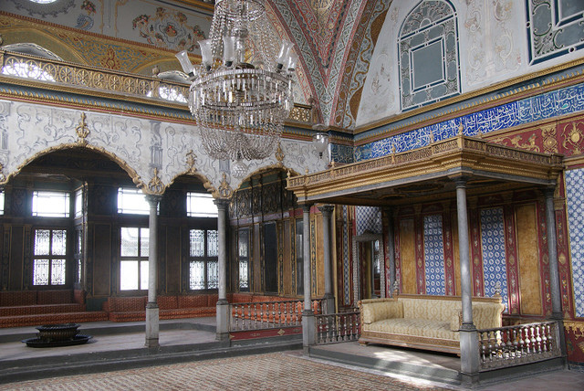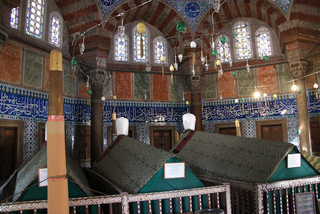等我們來到蘇萊曼清真寺,什麼?居然整個圍起來整修,原本還抱著期待說只是外部在整修而已,結果是整個封起來不准觀光客進入,所以只能在外面逛蘇萊曼一世的陵墓。這個建築也是錫南的作品,裡面都是鋪設了伊茲尼克的磁磚,除了有蘇萊曼一世的石棺之外,還有她女兒、蘇萊曼二世的石棺。