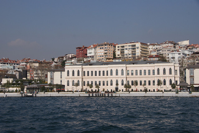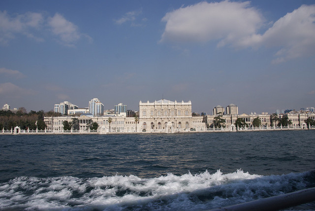 開船之後我們先在船的左手邊,因為可以看到多瑪巴哈切宮﹝Dolmabahçe Sarayı﹞,這個皇宮是第31代蘇丹開始耗時十年興建而成的,後來土耳其共和國之父凱末爾在伊斯坦堡的辦公室也選在這邊,據說裡面非常的富麗堂皇,興建的時候一共花了35噸的黃金,只是因為時間因素所以我們沒有去這邊參觀,就只是從海上欣賞一下它的外觀。