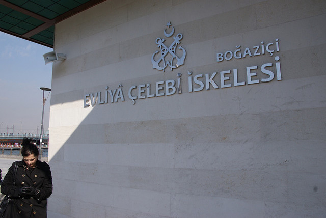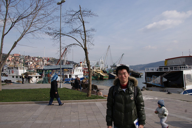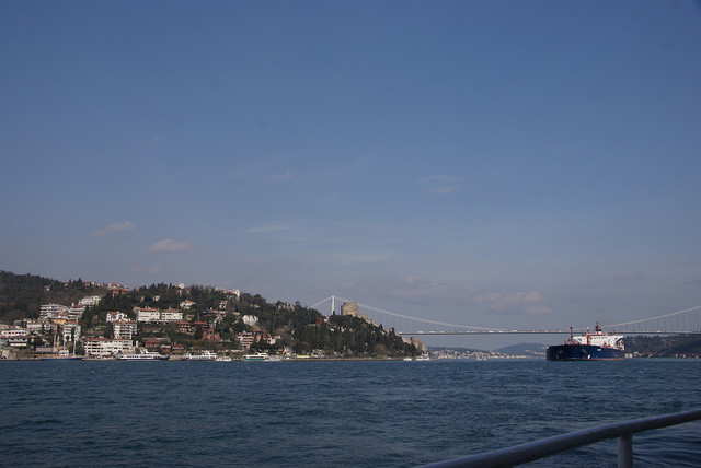 博斯普魯斯海峽﹝İstanbul Boğazı﹞算是亞洲和歐洲的一條天然界線,因為它可以控制黑海船艦的進出所以被宣告為公海的領域,也因為海峽最小寬度只有700公尺 ,所以幾乎可以說是世界上最短的國際航行海峽。要體驗這個歐亞大陸交界最好的方法當然是搭船,因此在Eminönü那邊總是有一堆人在招呼著觀光客搭乘他們的觀光船,他們總是唸著Bosporus, Bosporus…,聽他們連音、舌頭卻又不會打結的念法還滿有趣的。我們是選擇比較便宜的方式搭乘每天十點半出發的交通船﹝13 TL﹞,這班船買票的位置和之前要去亞陸區並不一樣,是在最靠近加拉達橋的那個矮房子。