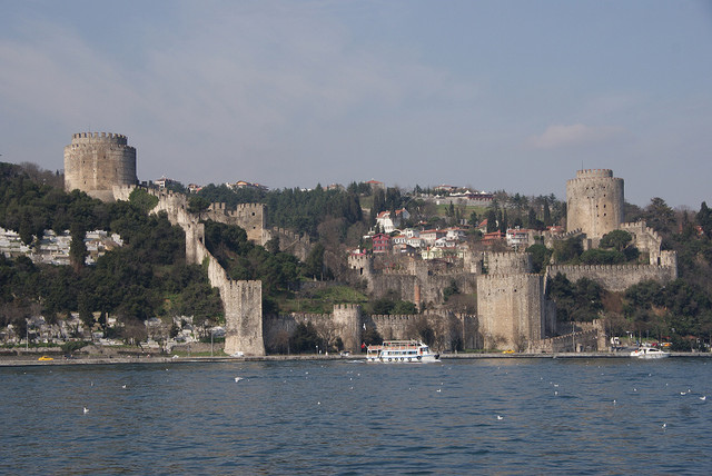 在左手邊出現了依靠著山坡修建而成的碉堡,這就是Rumeli Hisarı,這是在1452年間鄂圖曼土耳其帝國蘇丹Mehmed II為了攻占君士坦丁堡時修建的,為了封鎖海上的交通,所以也在對岸建了Anadolu Hisarı,這兩個碉堡相距大約660公尺 ,所以任何運送經過這邊的物資、武器都被擊沉,因此後來得以攻克君士坦丁堡。現在這邊改建成了散步道,可以慢慢走到山頂,由山頂眺望博斯普魯斯海峽應該十分美麗。