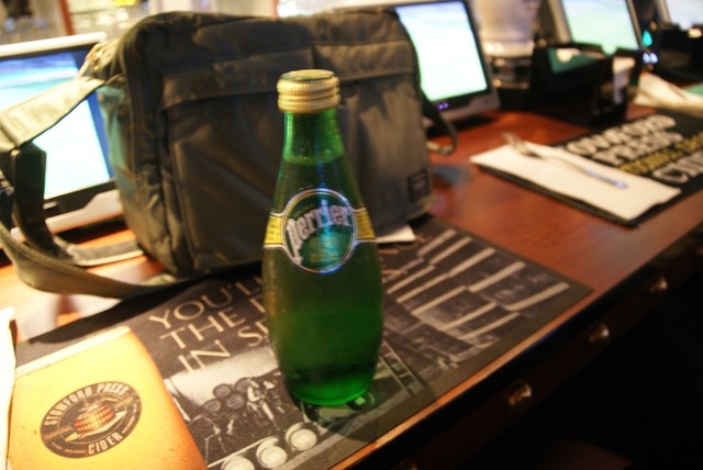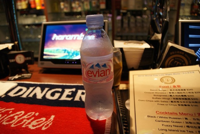 因為今天是季軍戰的關係,低消是700,理論上應該要趕快開始亂點,但是我假如從十二點就開始喝酒的話,可能還不到球員進場我已經倒在那邊了,加上Oliver也身體不是很舒服,我們就先點了Perrier﹝150﹞、Tonic Water﹝120﹞和Evian﹝150﹞,另外嘴巴饞的關係所以點了Buffalo Wings﹝300﹞,這個吃起來滿辣的,非常夠味,下酒的好配料;Corn Chips with Salsa居然賣完了,這讓平常看比賽都要吃Doritos的我好失望。
